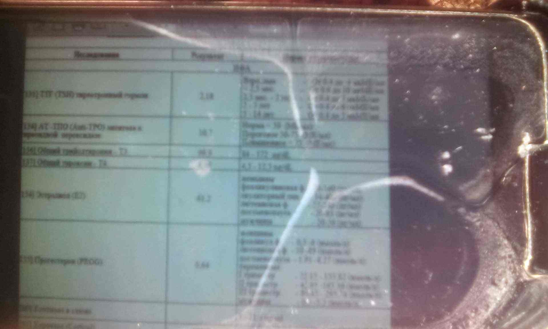 Ттг 2,18 от0,4до ме/мл,АТ-ТПО 10,7 норма 50 ме/мл.проговое 50-75 ме/мл.повышение 75 ме/мл,общий т3 ,99,9, ( 84-172 ng/DL) общий тироксии т4, 8,19 (4,5-12,5ng/DL)эстрадеол( е2 61,2 женщинам фелекулиновая ф20-160пг/мл),овуляторный пик34-400пг/мл лютеиновая ф27-246 пг,г постемен20-93,мужчины20-56 по/мл Прогестерон 0.64,05-6, кортизол192,6 63-660н моль. Цикал не спрашивал да и стыдно